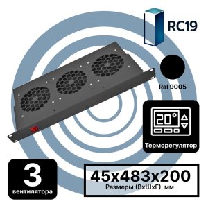 RC19 MV-400-3T-9005 Модуль вентиляторный 19amp;quot;, 1U, 3 вентиляторов с терморегулятором 0…+60 °C, регулируемая глубина 200-310мм, цвет черный Ral 9005