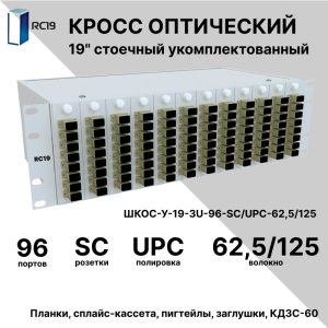 RC19 ШКОС-У-19-3U-96-SС/UPC-62,5/125 Кросс оптический 19amp;quot; стоечный 3U на 96 портов SС/UPC 62,5/125мкм укомплектованный оптический бокс (пигтейл SС/UPC 62,5/125-64шт, розетка SС-64шт, КДЗС-64шт)