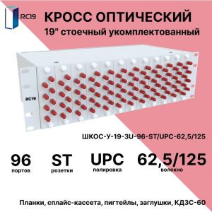 RC19 ШКОС-У-19-3U-96-ST/UPC-62,5/125 Кросс оптический 19amp;quot; стоечный 3U на 96 портов ST/UPC 62,5/125мкм укомплектованный оптический бокс (пигтейл ST/UPC 62,5/125-64шт, розетка ST-64шт, КДЗС-64шт)