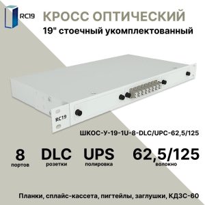 RC19 ШКОС-У-19-1U-8-DLC/UPC-62,5/125 Кросс оптический 19amp;quot; стоечный 1U на 8 портов LC/UPC duplex 62,5/125мкм укомплектованный оптический бокс (пигтейл LC 62,5/125-16шт, розетка DLC-8шт, КДЗС-16шт)