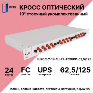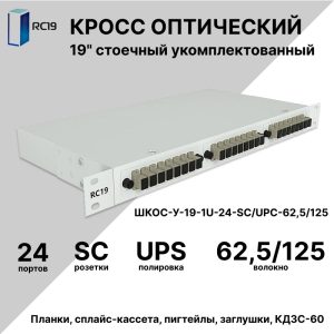 RC19 ШКОС-У-19-1U-24-SC/UPC-62,5/125 Кросс оптический 19amp;quot; стоечный 1U на 24 порта SC/UPC 62,5/125мкм укомплектованный оптический бокс (пигтейл SC 62,5/125-24шт, розетка SC-24шт, сплайс кассета, КДЗС-24шт)