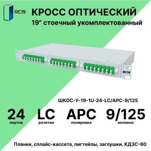 RC19 ШКОС-У-19-1U-24-LC/APC-9/125 Кросс оптический 19amp;quot; стоечный 1U на 24 порта LC/APC 9/125мкм укомплектованный оптический бокс (пигтейл LC/APC 9/125-24шт, розетка LC-24шт, КДЗС-24шт)