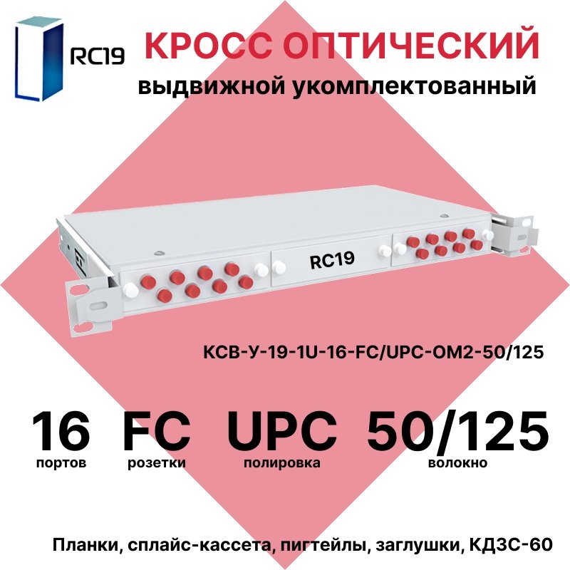 Купить по выгодной цене RC19 КСВ-У-19-1U-16-FC/UPC-OM2-50/125 Кросс оптический 19amp;quot; выдвижной 1U на 16 портов FC 50/125мкм укомплектованный (пигтейл FC 50/125 (OM2)-16шт, розетка FC-16шт, сплайс кассета с крышкой-1шт, КДЗС-16шт) в Anbik. Доставка по Москве и России. Самовывоз.