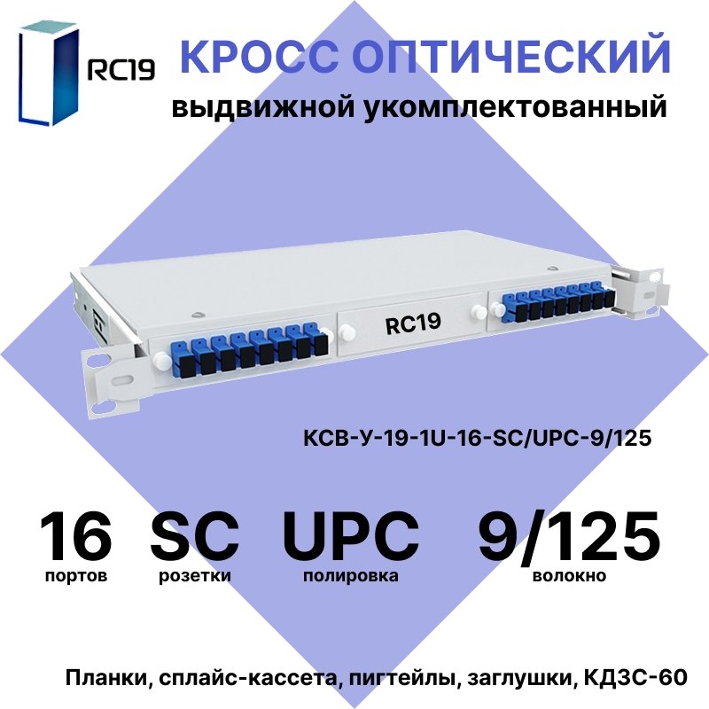Купить по выгодной цене RC19 КСВ-У-19-1U-16-SC/UPC-9/125 Кросс оптический 19amp;quot; выдвижной 1U на 16 портов SC/UPC 9/125мкм укомплектованный (пигтейл SC/UPC 9/125-16шт, розетка SC-16шт, сплайс кассета с крышкой-1шт, КДЗС-16шт) в Anbik. Доставка по Москве и России. Самовывоз.