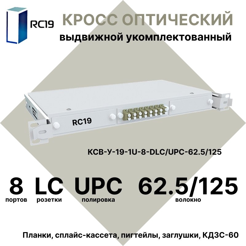 Купить по выгодной цене RC19 КСВ-У-19-1U-8-DLC/UPC-62.5/125 Кросс оптический 19amp;quot; выдвижной 1U на 8 портов DLC 62,5/125мкм укомплектованный (пигтейл LC 62.5/125-16шт, розетка DLC-8шт, сплайс кассета с крышкой-1шт, КДЗС-16шт) в Anbik. Доставка по Москве и России. Самовывоз.