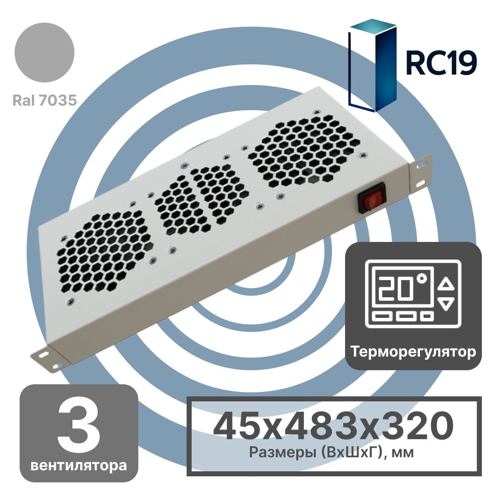 Купить по выгодной цене RC19 MV-400-3T Модуль вентиляторный 19 1U, 3 вентиляторов с терморегулятором 0…+60 °C, регулируемая глубина 200-310мм серый Ral 7035 в Anbik. Доставка по Москве и России. Самовывоз.