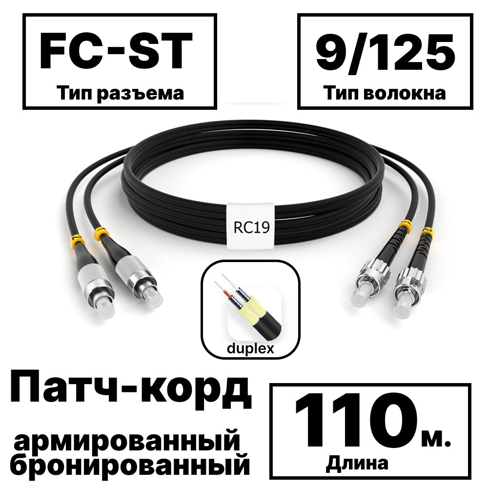 RC19 PC-ARM-2x3,0-2FC/UPC-2ST/UPC-SM-110м-LSZH-BK Патч-корд оптический армированный бронированный duplex FC-ST 9/125 (G.657A1) одномодовый SM (3.0мм) LSZH, цвет черный, 110м