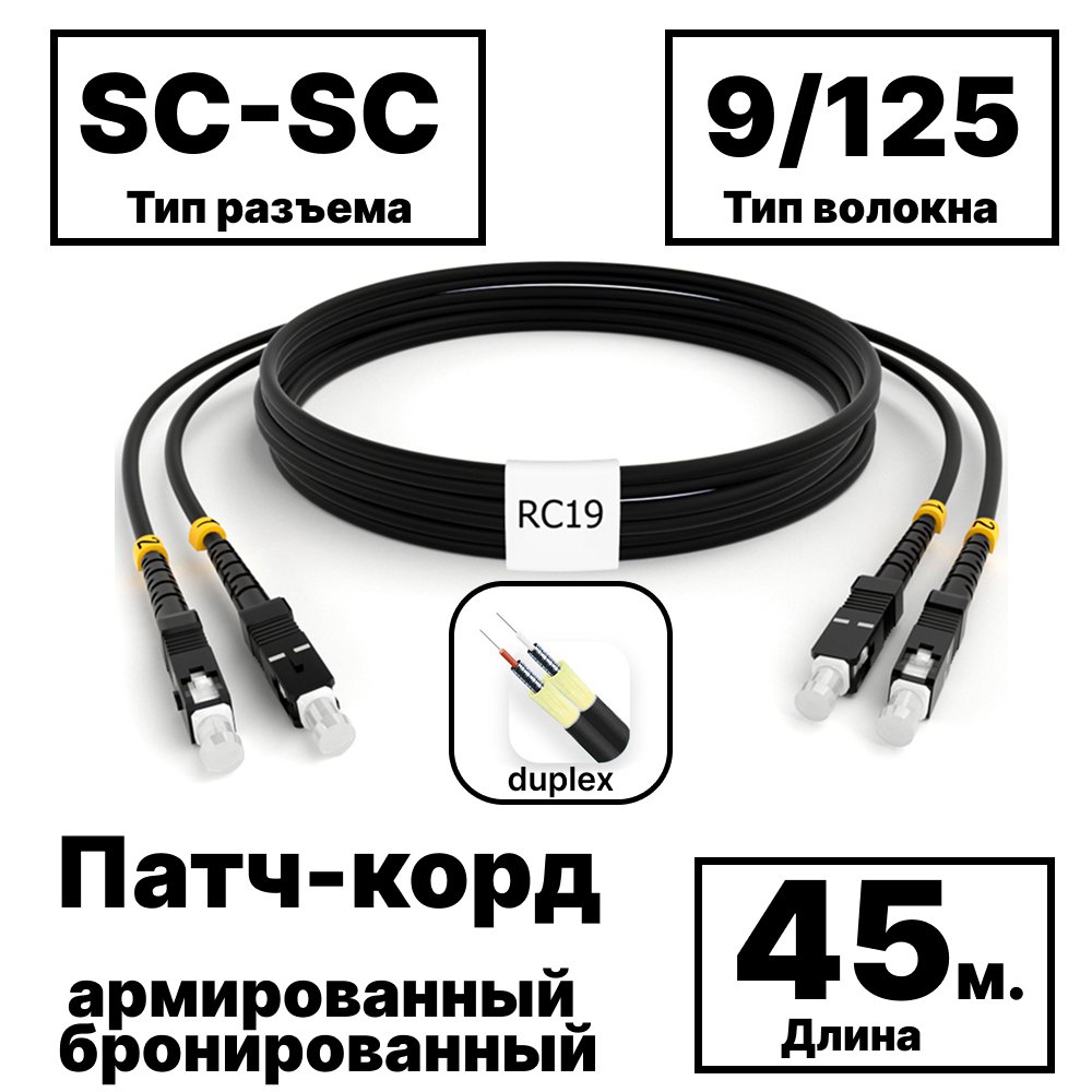 RC19 PC-ARM-2x3,0-2SC/UPC-2SC/UPC-SM-45м-LSZH-BK Патч-корд оптический армированный бронированный duplex SC-SC 9/125 (G.657A1) одномодовый SM (3.0мм) LSZH, цвет черный, 45м