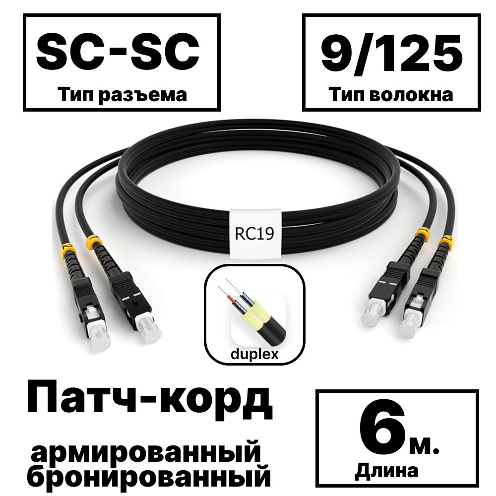 RC19 PC-ARM-2x3,0-2SC/UPC-2SC/UPC-SM-6м-LSZH-BK Патч-корд оптический армированный бронированный duplex SC-SC 9/125 (G.657A1) одномодовый SM (3.0мм) LSZH, цвет черный, 6м