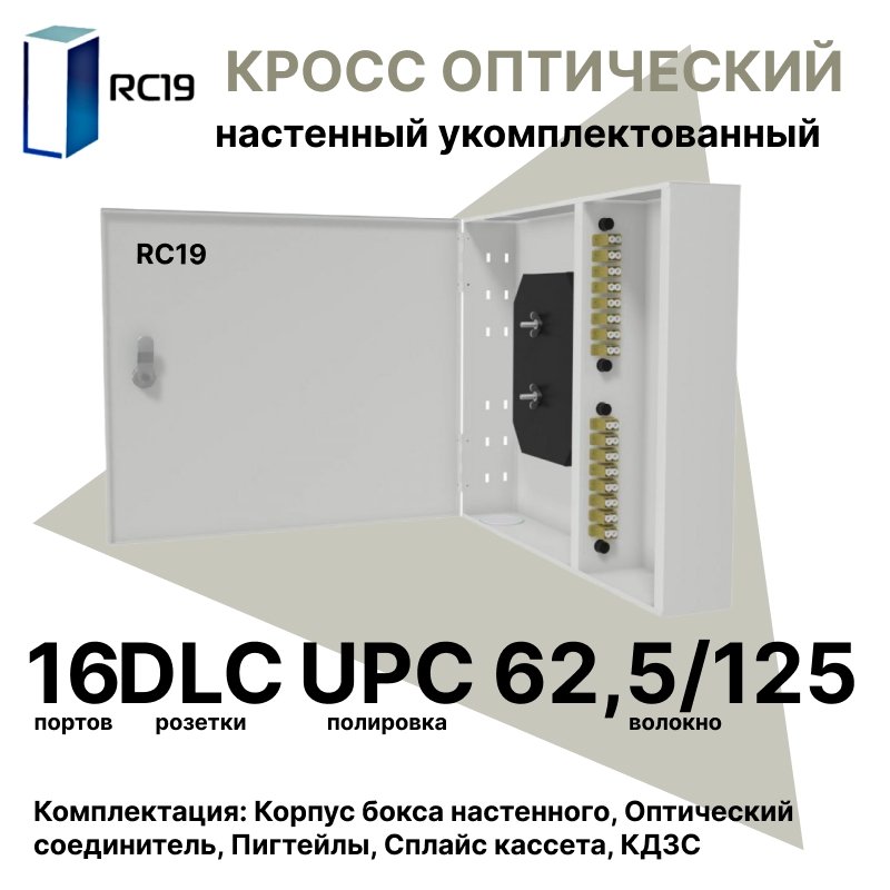 RC19 ШКОН-У-16-DLC/UPC-62,5/125 Кросс оптический настенный на 16 портов DLC 62,5/125мкм предсобранный (пигтейл LC 62,5/125-32шт, розетка DLC-16шт, планки SC/DLC, сплайс кассета с крышкой-1шт, КДЗС-32шт) Оптический настенный бокс укомплектованный 16 DLC/U