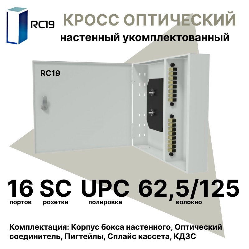 Купить по выгодной цене RC19 ШКОН-У-16-SC/UPC-62,5/125 Кросс оптический настенный на 16 портов SC 62,5/125мкм предсобранный (пигтейл SC 62,5/125-16шт, розетка SC-16шт, планки SC/DLC, сплайс кассета с крышкой-1шт, КДЗС-16шт) Оптический настенный бокс укомплектованный 16 SC/UPC в Anbik. Доставка по Москве и России. Самовывоз.