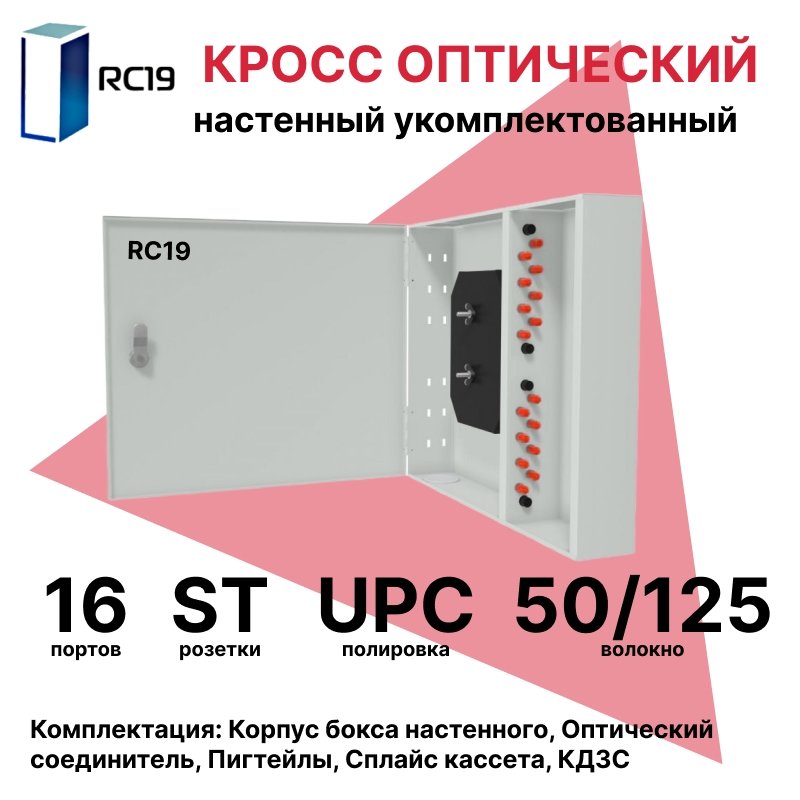 RC19 ШКОН-У-16-ST/UPC-ОМ3-50/125 Кросс оптический настенный на 16 портов ST 50/125мкм (ОМ3) предсобранный (пигтейл ST 50/125 (ОМ3)-16шт, розетка ST-16шт, планки FC/ST, сплайс кассета с крышкой-1шт, КДЗС-16шт) Оптический настенный бокс укомплектованный 16