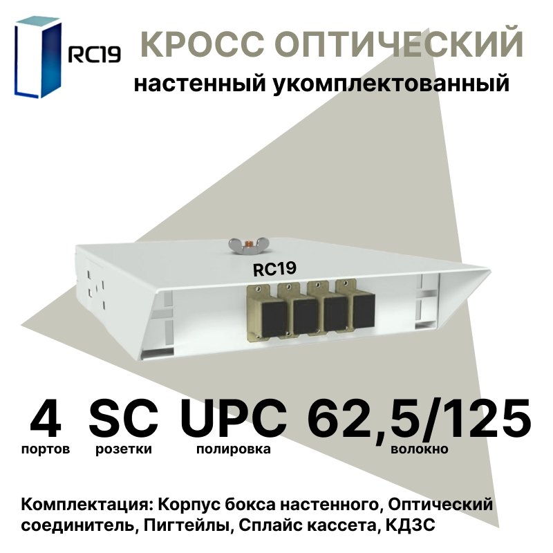 Купить по выгодной цене RC19 ШКОН-У-4-SC/UPC-62,5/125 Кросс оптический настенный на 4 порта SC 62,5/125мкм предсобранный (пигтейл SC 62,5/125-4шт, розетка SC-4шт, ложемент, КДЗС-4шт) Оптический настенный бокс укомплектованный 4 SC/UPC в Anbik. Доставка по Москве и России. Самовывоз.