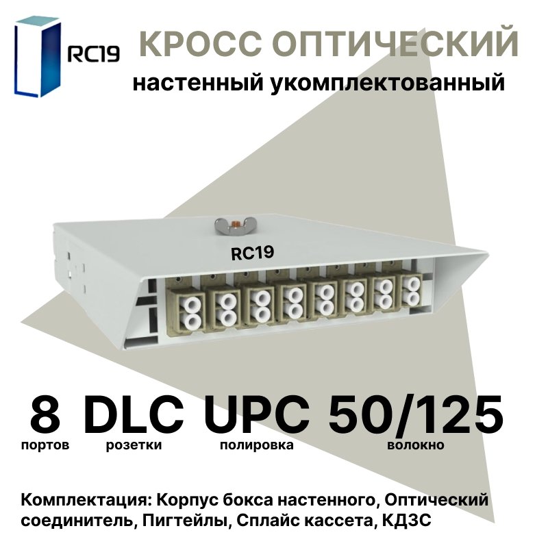 Купить по выгодной цене RC19 ШКОН-У-8-DLC/UPC-ОМ3-50/125 Кросс оптический настенный на 8 портов DLC 50/125мкм (ОМ3) предсобранный (пигтейл LC 50/125 (ОМ3)-16шт, розетка DLC-8шт, ложемент, КДЗС-16шт) Оптический настенный бокс укомплектованный 8 LC/UPC в Anbik. Доставка по Москве и России. Самовывоз.