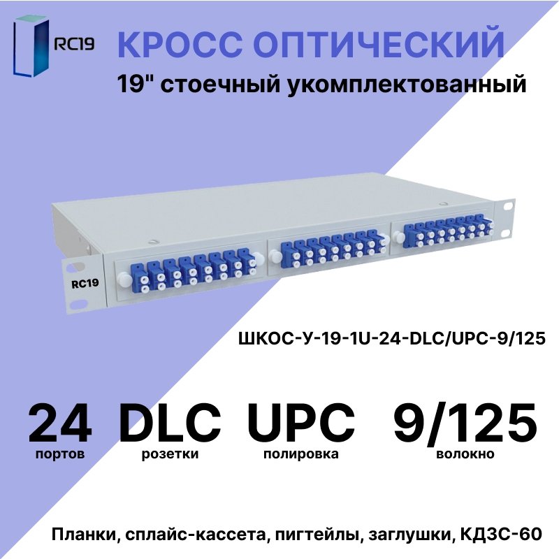 RC19 ШКОС-У-19-1U-24-DLC/UPC-9/125 Кросс оптический 19amp;quot; стоечный 1U на 24 порта DLC/UPC 9/125мкм укомплектованный оптический бокс (пигтейл LC 9/125-48шт, розетка DLC-24шт, КДЗС-48шт)