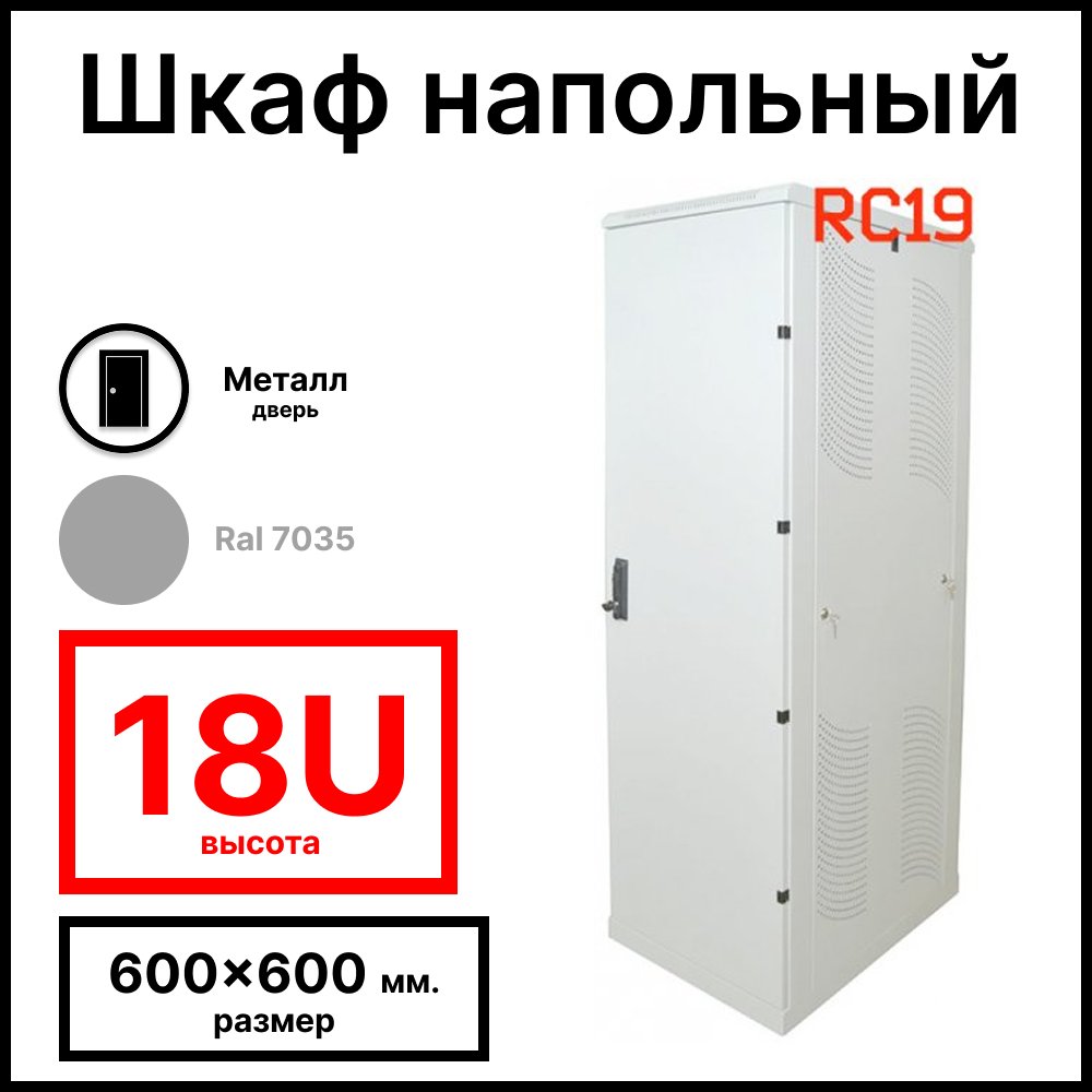 Купить по выгодной цене Шкаф серверный телекоммуникационный напольный 19amp;quot; 18U 600x600x988мм (ШхГхВ), передняя дверь металлическая, цвет серый Ral7035 RC19 в Anbik. Доставка по Москве и России. Самовывоз.