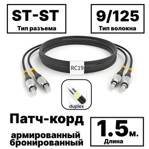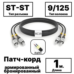 RC19 PC-ARM-2×3,0-2ST/UPC-2ST/UPC-SM-1.5м-LSZH-BK Патч-корд оптический армированный бронированный duplex ST-ST 9/125 (G.657A1) одномодовый SM (3.0мм) LSZH, цвет черный, 1,5м