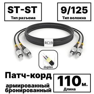 RC19 PC-ARM-2×3,0-2ST/UPC-2ST/UPC-SM-110м-LSZH-BK Патч-корд оптический армированный бронированный duplex ST-ST 9/125 (G.657A1) одномодовый SM (3.0мм) LSZH, цвет черный, 110м