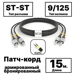 RC19 PC-ARM-2×3,0-2ST/UPC-2ST/UPC-SM-15м-LSZH Патч-корд оптический армированный бронированный duplex ST-ST 9/125 (G.657A1) одномодовый SM (3.0мм) LSZH, 15м армированный шнур оптический duplex O 3,0мм