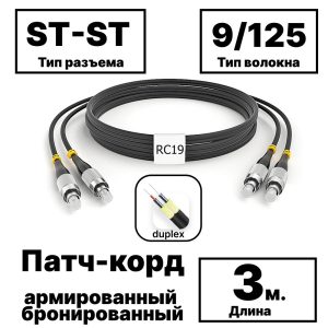RC19 PC-ARM-2×3,0-2ST/UPC-2ST/UPC-SM-3м-LSZH-BK Патч-корд оптический армированный бронированный duplex ST-ST 9/125 (G.657A1) одномодовый SM (3.0мм) LSZH, цвет черный, 3м