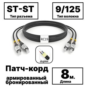 RC19 PC-ARM-2×3,0-2ST/UPC-2ST/UPC-SM-8м-LSZH-BK Патч-корд оптический армированный бронированный duplex ST-ST 9/125 (G.657A1) одномодовый SM (3.0мм) LSZH, цвет черный, 8м