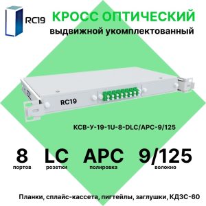 RC19 КСВ-У-19-1U-8-DLC/APC-9/125 Кросс оптический 19amp;quot; выдвижной 1U на 8 портов DLC 50/125мкм укомплектованный (пигтейл LC 50/125 (OM2)-16шт, розетка DLC-8шт, сплайс кассета с крышкой-1шт, КДЗС-16шт)