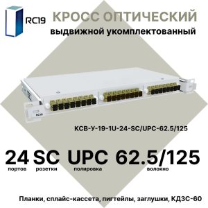 RC19 КСВ-У-19-1U-24-SC/UPC-62.5/125 Кросс оптический 19amp;quot; выдвижной 1U на 24 портов SC 62,5/125мкм укомплектованный (пигтейл SC 62,5/125-24шт, розетка SC-24шт, сплайс кассета с крышкой-1шт, КДЗС-24шт)
