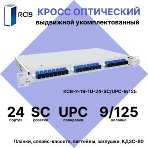 RC19 КСВ-У-19-1U-24-SC/UPC-9/125 Кросс оптический 19amp;quot; выдвижной 1U на 24 портов SC/UPC 9/125мкм укомплектованный (пигтейл SC/UPC 9/125-24шт, розетка SC-24шт, сплайс кассета с крышкой-1шт, КДЗС-24шт)