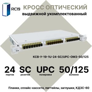 RC19 КСВ-У-19-1U-24-SC/UPC-OM3-50/125 Кросс оптический 19amp;quot; выдвижной 1U на 24 портов SC 50/125мкм (OM3) укомплектованный (пигтейл SC 50/125 (OM3)-24шт, розетка SC-24шт, сплайс кассета с крышкой-1шт, КДЗС-24шт)