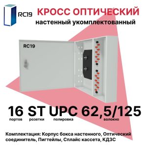 RC19 ШКОН-У-16-ST/UPC-62,5/125 Кросс оптический настенный на 16 портов ST 62,5/125мкм предсобранный (пигтейл ST 62,5/125-16шт, розетка ST-16шт, планки FC/ST, сплайс кассета с крышкой-1шт, КДЗС-16шт) Оптический настенный бокс укомплектованный 16 ST/UPC