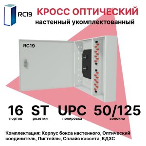 RC19 ШКОН-У-16-ST/UPC-ОМ3-50/125 Кросс оптический настенный на 16 портов ST 50/125мкм (ОМ3) предсобранный (пигтейл ST 50/125 (ОМ3)-16шт, розетка ST-16шт, планки FC/ST, сплайс кассета с крышкой-1шт, КДЗС-16шт) Оптический настенный бокс укомплектованный 16