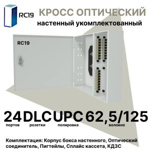RC19 ШКОН-У-24-DLC/UPC-62,5/125 Кросс оптический настенный на 24 порта DLC 62,5/125мкм предсобранный (пигтейл LC 62,5/125-48шт, розетка DLC-24шт, планки SC/DLC, сплайс кассета-2шт, крышка для сплайс кассеты-1шт, КДЗС-48шт) Оптический настенный бокс укомп