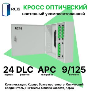 RC19 ШКОН-У-24-DLC/APC-9/125 Кросс оптический настенный на 24 порта LC/APC duplex 9/125мкм укомплектованый(пигтейл LC/APC 9/125-48шт, розетка DLC-24шт, планки SC/DLC, сплайс кассета-2шт, крышка для сплайс кассеты-1шт, КДЗС-48шт) Оптический настенный бокс