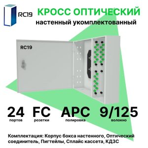 RC19 ШКОН-У-24-FC/APC-9/125 Кросс оптический настенный на 24 порта FC/APC 9/125мкм укомплектованый(пигтейл FC/APC 9/125-24шт, розетка FC-24шт, планки FC/ST, сплайс кассета с крышкой-1шт, КДЗС-24шт) Оптический настенный бокс укомплектованный 24 FC/APC