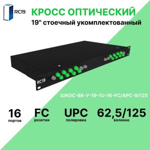 RC19 ШКОС-BK-У-19-1U-16-FC/UPC-9/125 Кросс оптический 19amp;quot; стоечный 1U на 16 портов FC/UPC 9/125мкм укомплектованный, цвет черный (пигтейл FC 9/125-16шт, розетка FC-16шт, КДЗС-16шт)