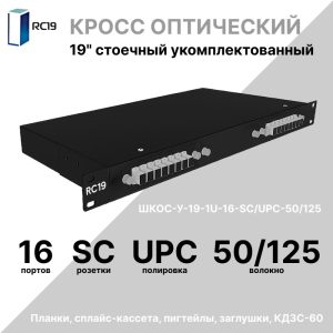 RC19 ШКОС-BK-У-19-1U-16-SC/UPC-50/125 Кросс оптический 19amp;quot; стоечный 1U на 16 портов SC/UPC 50/125мкм укомплектованный, цвет черный (пигтейл SC 50/125-16шт, розетка SC-16шт, КДЗС-16шт)