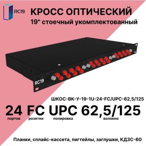 RC19 ШКОС-BK-У-19-1U-24-FC/UPC-62,5/125 Кросс оптический 19amp;quot; стоечный 1U на 24 порта FC/UPC 62,5/125мкм укомплектованный, цвет черный ((пигтейл FC 62,5/125-24шт, розетка FC-24шт, КДЗС-24шт)