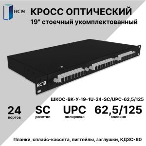 RC19 ШКОС-BK-У-19-1U-24-SC/UPC-62,5/125 Кросс оптический 19amp;quot; стоечный 1U на 24 порта SC/UPC 62,5/125мкм укомплектованный, цвет черный (пигтейл SC 62,5/125-24шт, розетка SC-24шт, сплайс кассета, КДЗС-24шт)