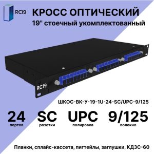 RC19 ШКОС-BK-У-19-1U-24-SC/UPC-9/125 Кросс оптический 19amp;quot; стоечный 1U на 24 порта SC/UPC 9/125мкм укомплектованный, цвет черный (пигтейл SC 9/125-24шт, розетка SC-24шт, сплайс кассета, КДЗС-24шт)