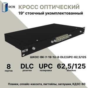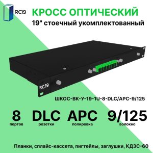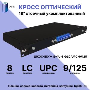 RC19 ШКОС-BK-У-19-1U-8-DLC/APC-9/125 Кросс оптический 19amp;quot; стоечный 1U на 8 портов LC/APC duplex 9/125мкм укомплектованный, цвет черный (пигтейл LC/APC 9/125-16шт, розетка DLC/APC-8шт, КДЗС-16шт)