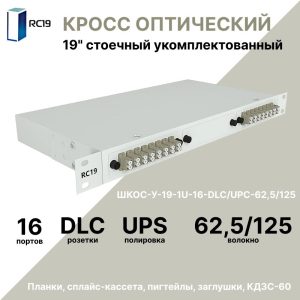 RC19 ШКОС-У-19-1U-16-DLC/UPC-62,5/125 Кросс оптический 19amp;quot; стоечный 1U на 16 портов LC/UPC duplex 62,5/125мкм укомплектованный оптический бокс (пигтейл LC 62,5/125-32шт, розетка DLC-16шт, КДЗС-32шт)