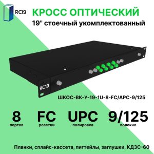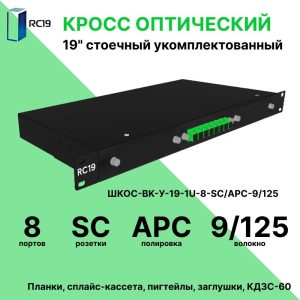 RC19 ШКОС-BK-У-19-1U-8-SC/APC-9/125 Кросс оптический 19amp;quot; стоечный 1U на 8 портов SC/APC 9/125мкм укомплектованный, цвет черный (пигтейл SC/APC 9/125-8шт, розетка SC/APC-8шт, КДЗС-8шт)