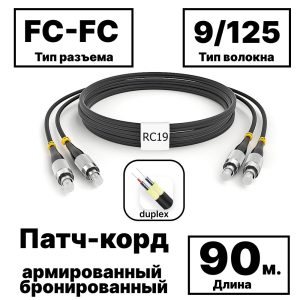 RC19 PC-ARM-2×3,0-2FC/UPC-2FC/UPC-SM-90м-LSZH Патч-корд оптический армированный бронированный duplex FC-FC 9/125 (G.657A1) одномодовый SM (3.0мм) LSZH, 90м duplex O 3,0мм