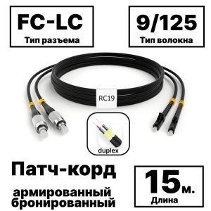 RC19 PC-ARM-2×3,0-2FC/UPC-2LC/UPC-SM-15м-LSZH Патч-корд оптический армированный бронированный duplex FC-LC 9/125 (G.657A1) одномодовый SM (3.0мм) LSZH, 15м армированный шнур оптический duplex O 3,0мм