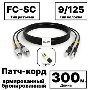RC19 PC-ARM-2×3,0-2FC/UPC-2SC/UPC-SM-300м-LSZH Патч-корд оптический армированный бронированный duplex FC-SC 9/125 (G.657A1) одномодовый SM (3.0мм) LSZH, 300м армированный шнур оптический duplex O 3,0мм