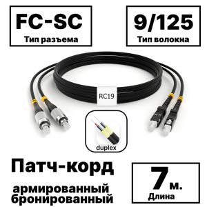 RC19 PC-ARM-2×3,0-2FC/UPC-2SC/UPC-SM-7м-LSZH Патч-корд оптический армированный бронированный duplex FC-SC 9/125 (G.657A1) одномодовый SM (3.0мм) LSZH, 7м армированный шнур оптический duplex O 3,0мм