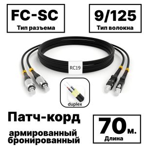 RC19 PC-ARM-2×3,0-2FC/UPC-2SC/UPC-SM-70м-LSZH Патч-корд оптический армированный бронированный duplex FC-SC 9/125 (G.657A1) одномодовый SM (3.0мм) LSZH, 70м армированный шнур оптический duplex O 3,0мм